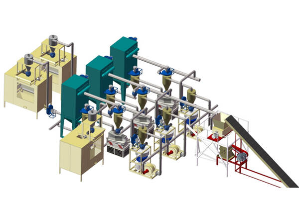 3、破碎过的颗粒达到1-2公分,再由送料螺旋送入三级磨粉机进行磨粉;